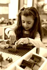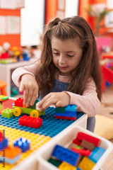 Adorable hispanic girl playing with construction blocks sitting on table at kindergarten