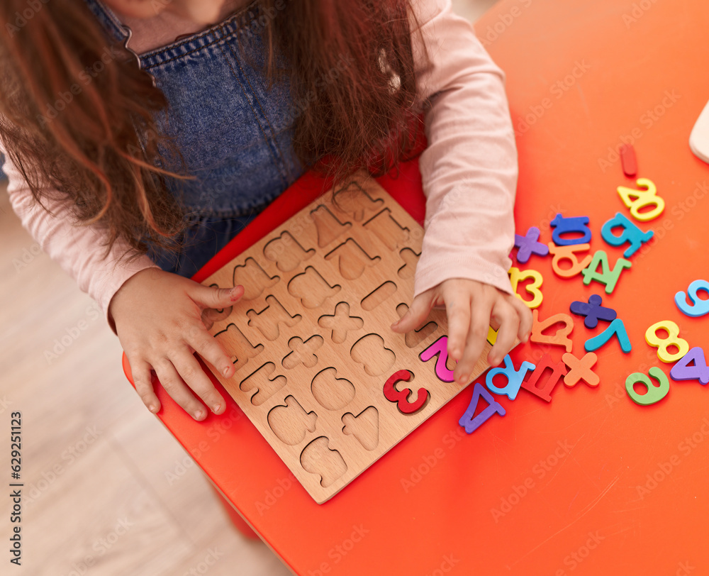 Adorable hispanic girl playing with maths puzzle game sitting on table at kindergarten