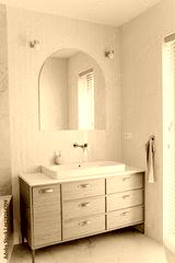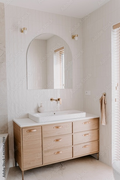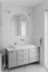 Modern bathroom featuring a white porcelain sink in front of a large mirror