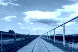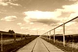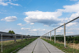 Ścieżka chodnikowa wokół zieleni w okołowiejskich terenach zachodniej Polski w letniej porze przy niemal błękitnym niebem i umiarkowanym zachmurzeniem