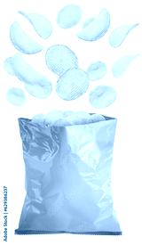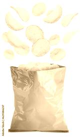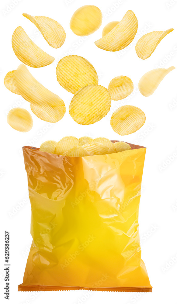 Crispy Potato chips fly out of yellow bag isolated on white background, Potato chips on white PNG File.