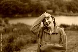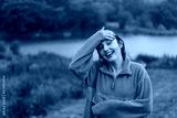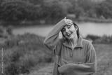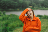 Portrait of a young girl in an orange sweater enjoying the rain on a summer day. The girl is having fun and dancing under the summer rain