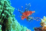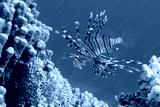 Red lionfish swimming on the coral reef. Dangerous fish and corals. Scuba diving with tropical marine life. Predator fish portrait, vivid blue ocean. Aquatic wildlife, travel photo.