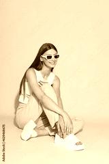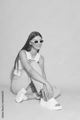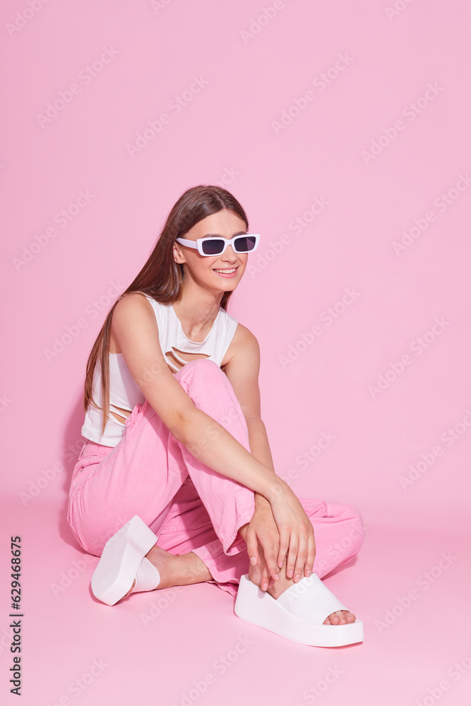 Young fashion woman in pink trendy jeans and white top on pink background.