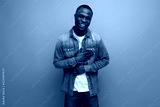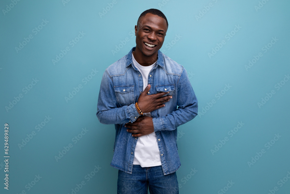 portrait of a 30 year old laughing american man with short hair dressed stylishly in spring clothes on a blue background with copy space