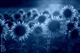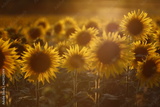 Słoneczniki w zachodzącym Słońcu na polu wykonane pod Słońce