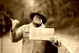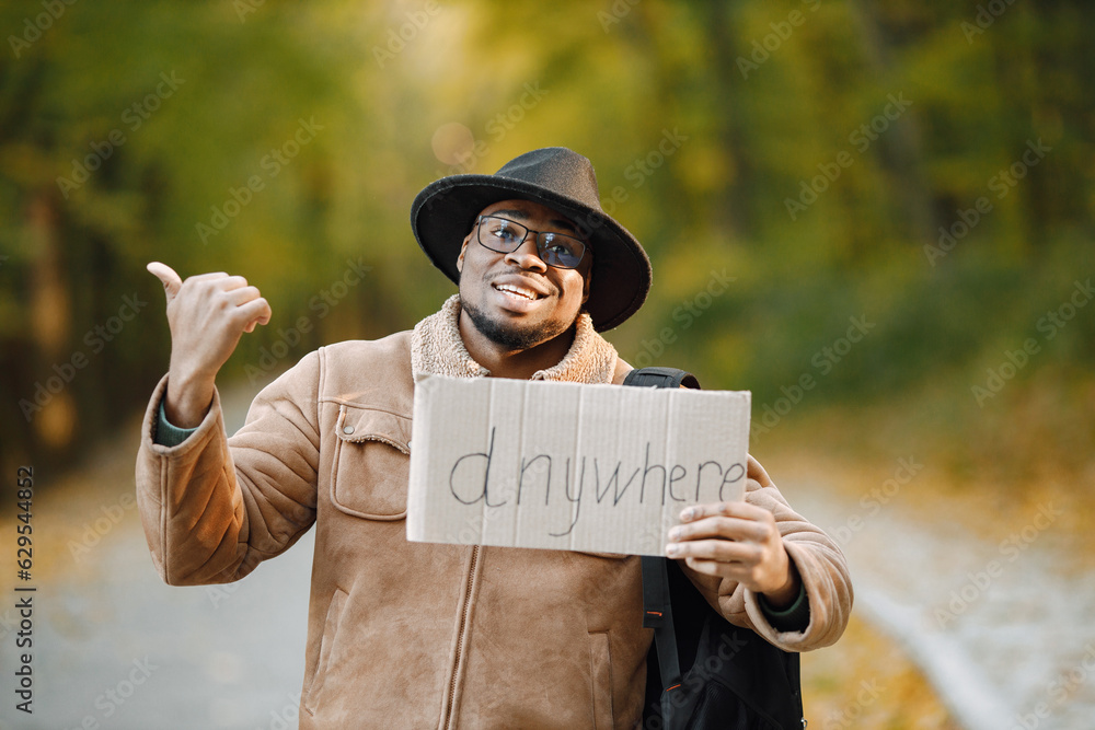 Black man hitchhiking on a road and holding a cardboard sign anywhere