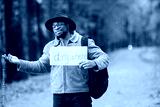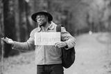 Black man hitchhiking on a road and holding a sign anywhere