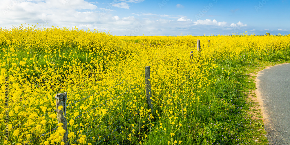 Yellow mustard flowers in bloom in the salt marshes of the natural reserve of Lilleau des Niges on the Ile de Ré island in France