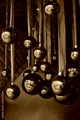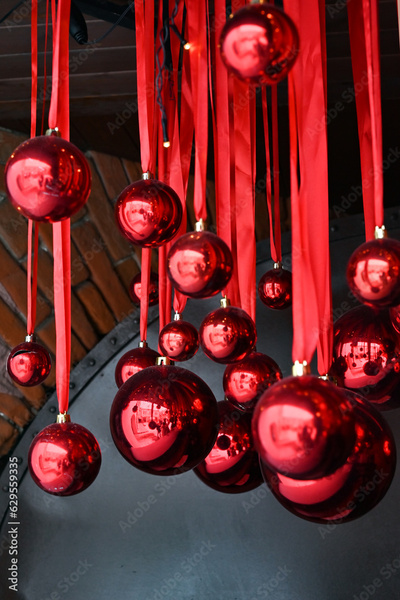 New Year's decoration on the street of the city. red Christmas balls on ribbons. High quality photo