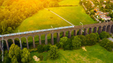 UK Commuter Train Travelling Across a Viaduct at Sunset.