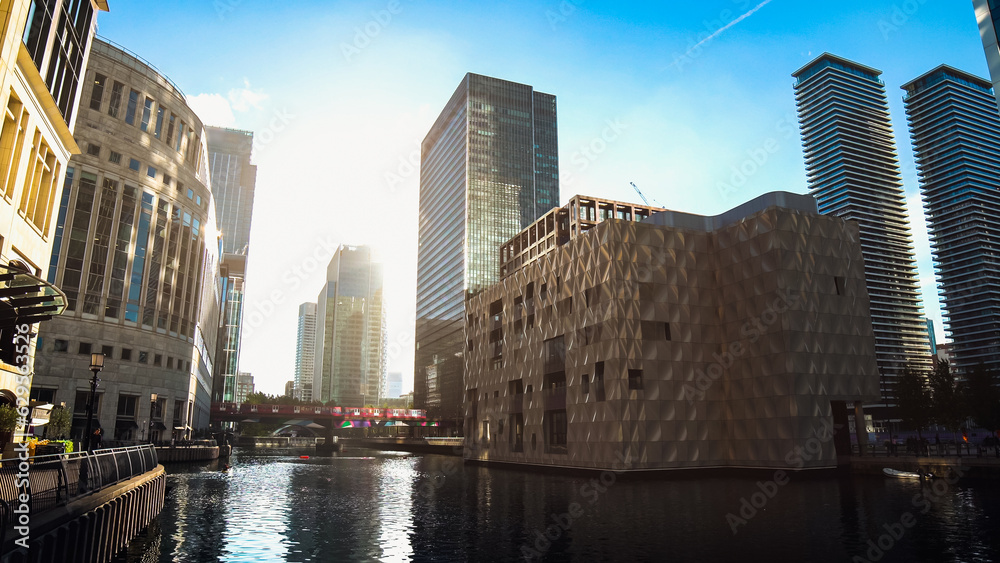 Up view in financial district. London, United Kingdom - The bank district of central London with famous skyscrapers. Modern architecture in the city.