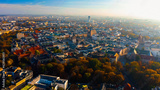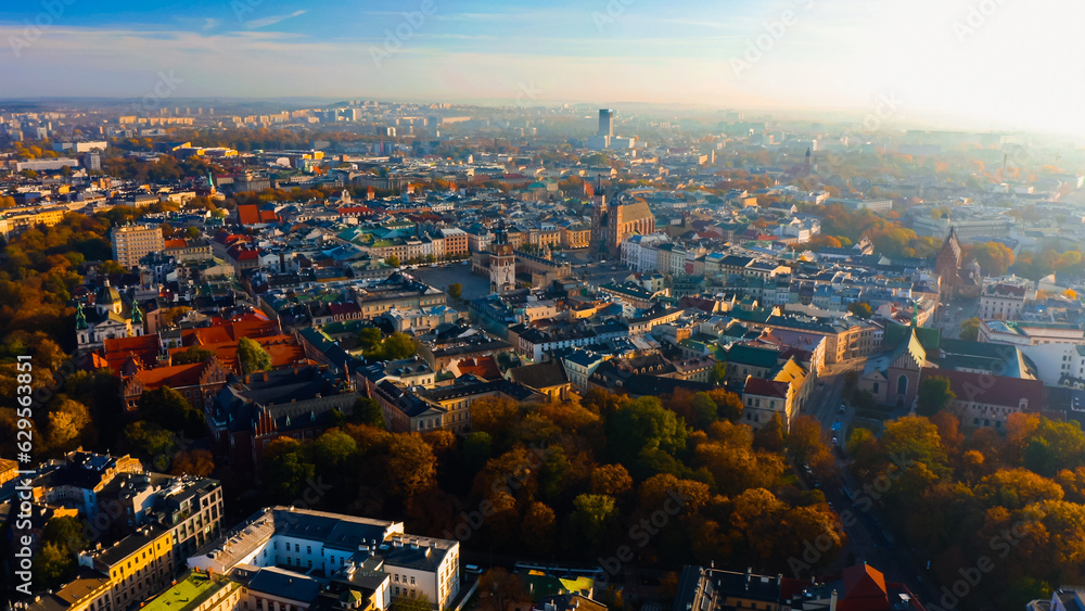 View over town with historic market square, Krakow, Poland, Europe. Krakow Market Square from above, aerial view of old city center view in Krakow.