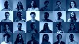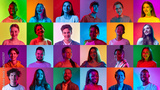 Collage of close-up shoots of ethnically diverse pensive, doubtful people, men and women expressing uncertain emotions over neon background.