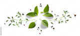 Collection of fresh herb leaves. thymeand basil Spices, herbs on a white table. PNG Food background design element with transparent shadow on transparent background.