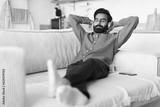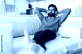 Middle Eastern man resting with headphones enjoying favorite music indoor