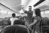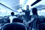 Cheerful man looking at his wife with a smile and putting carry on luggage in compartment while traveling together with his family by plane. Family vacation, transportation concept