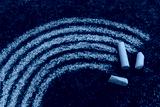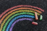 Close-up of a rainbow painted on a road with sidewalk chalk, shot from above
