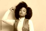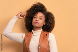 confident brazilian woman flexing arms in all beige colors. strong, power, proud concept.