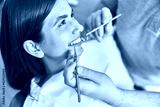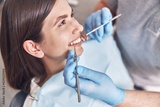 Confident mature doctor is checking teeth of young beautiful happy caucasian woman in modern clinic