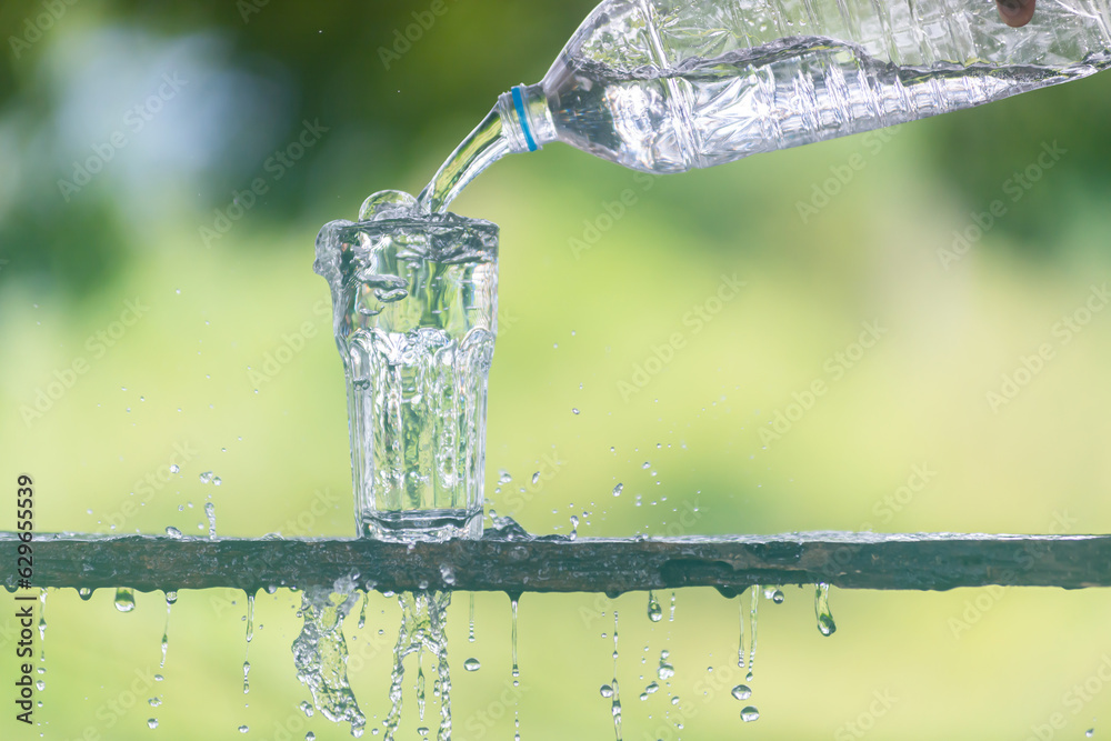 Water flows into a glass placed on a wooden bar.Water splash in glass Select focus blurred background.Drink water pouring in to glass over sunlight and natural green background.Nature conservation .