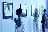 Diverse group of teenagers looking at abstract art in art gallery or museum standing in row with African American girl in foreground