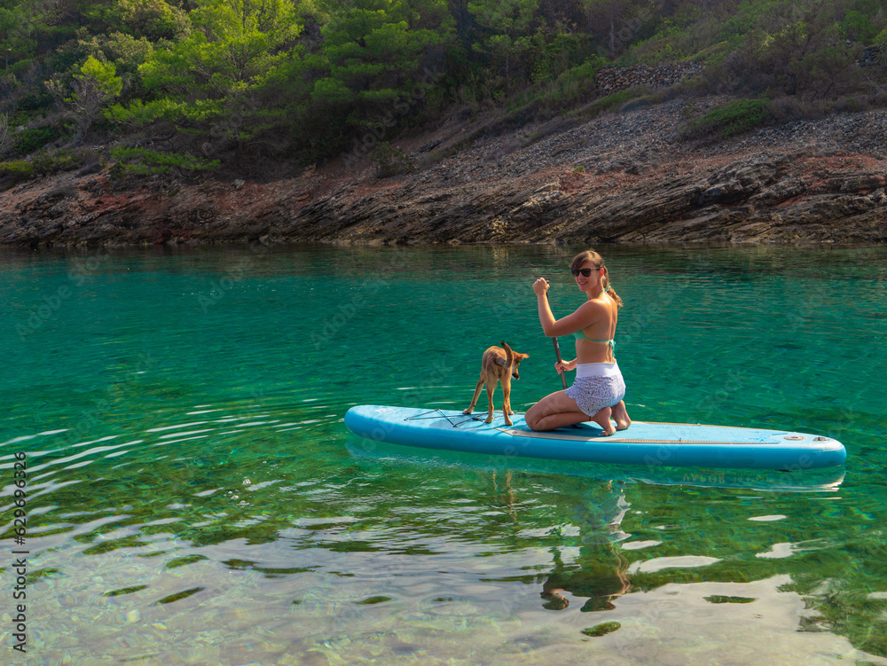 Pretty lady enjoys cruising the beautiful bay on SUP with her adorable young dog