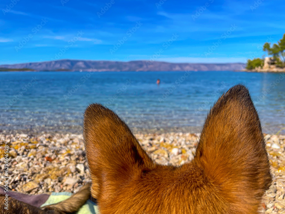 CLOSE UP, DOF: Raised brown ears of a young puppy looking towards the blue sea