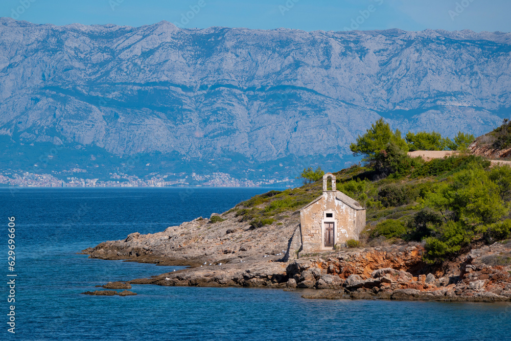 Abandoned old stone chapel on the edge of a small rocky cape on island of Hvar