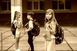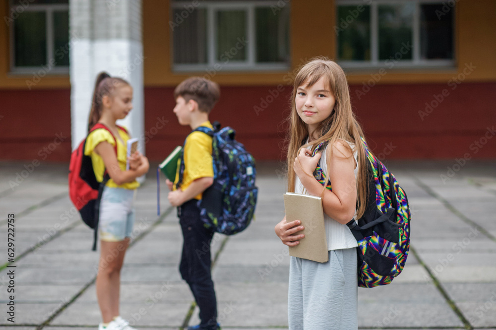 Schoolgirl with book and backpack outdoor. Back to school. Beginning of school lessons.