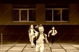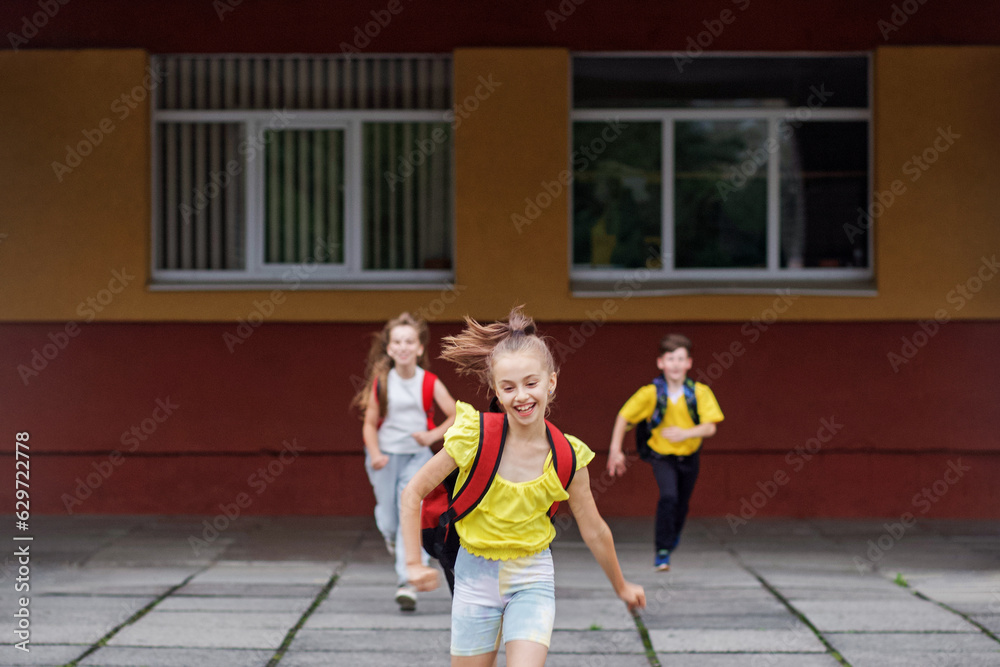 Schoolchildren run from school. Classmates with backpacks. Back to school.