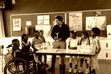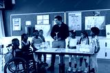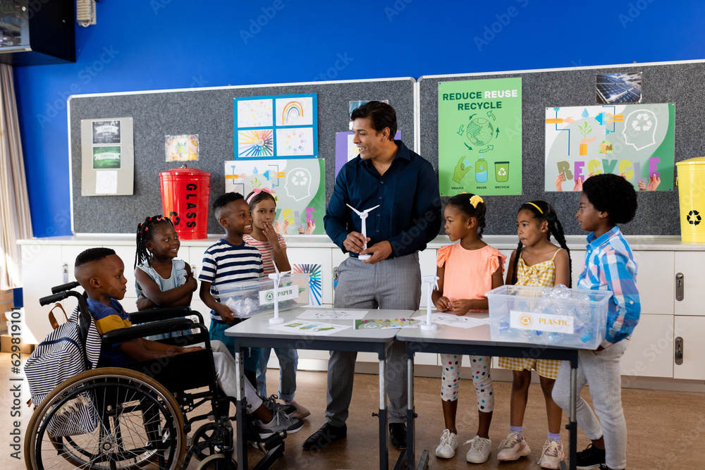 Happy diverse male teacher and children with ecology items in class at elementary school