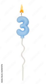 Burning air balloon shaped birthday candle isolated on white background. Number 3.