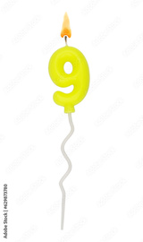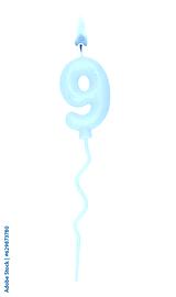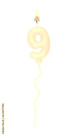 Burning air balloon shaped birthday candle isolated on white background. Number 9.
