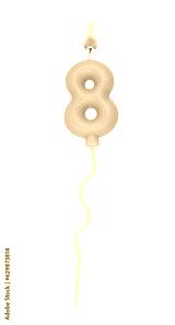 Burning air balloon shaped birthday candle isolated on white background. Number 8.