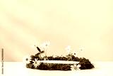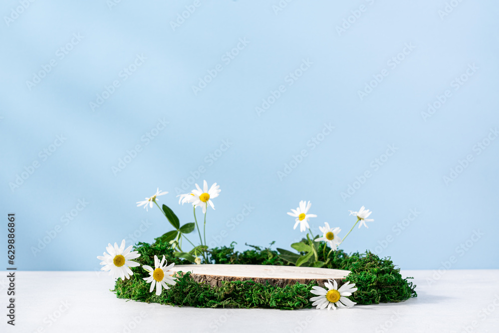 Wooden cut podium surrounded by white chamomile flowers and green moss. Stand for presentation of beauty products, skin care