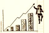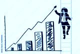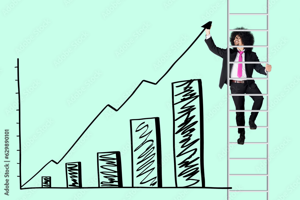 Portrait of Afro businessman standing on the ladder while drawing chart and upward arrow