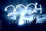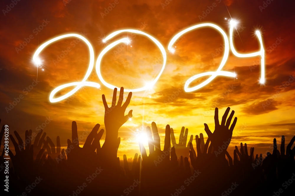 Silhouette of crowd hands celebrating the 2024 new year outdoors
