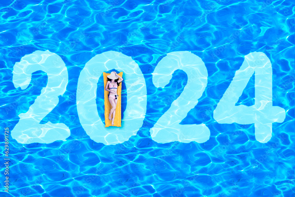 woman in bikini lying on the inflatable float with 2024 number in the swimming pool