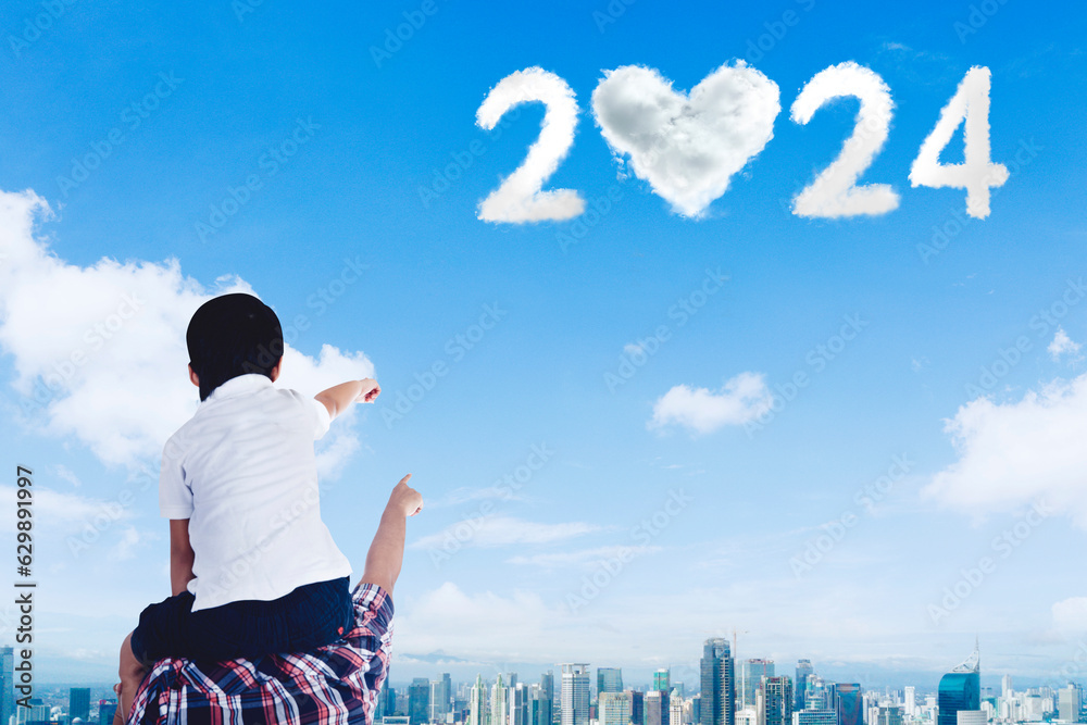 Rear view of a little girl with her father pointing at clouds shaped number 2024