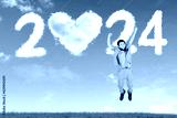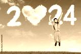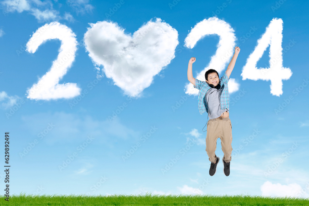 Happy Asian male teenagers jumping over 2024 new year numbers