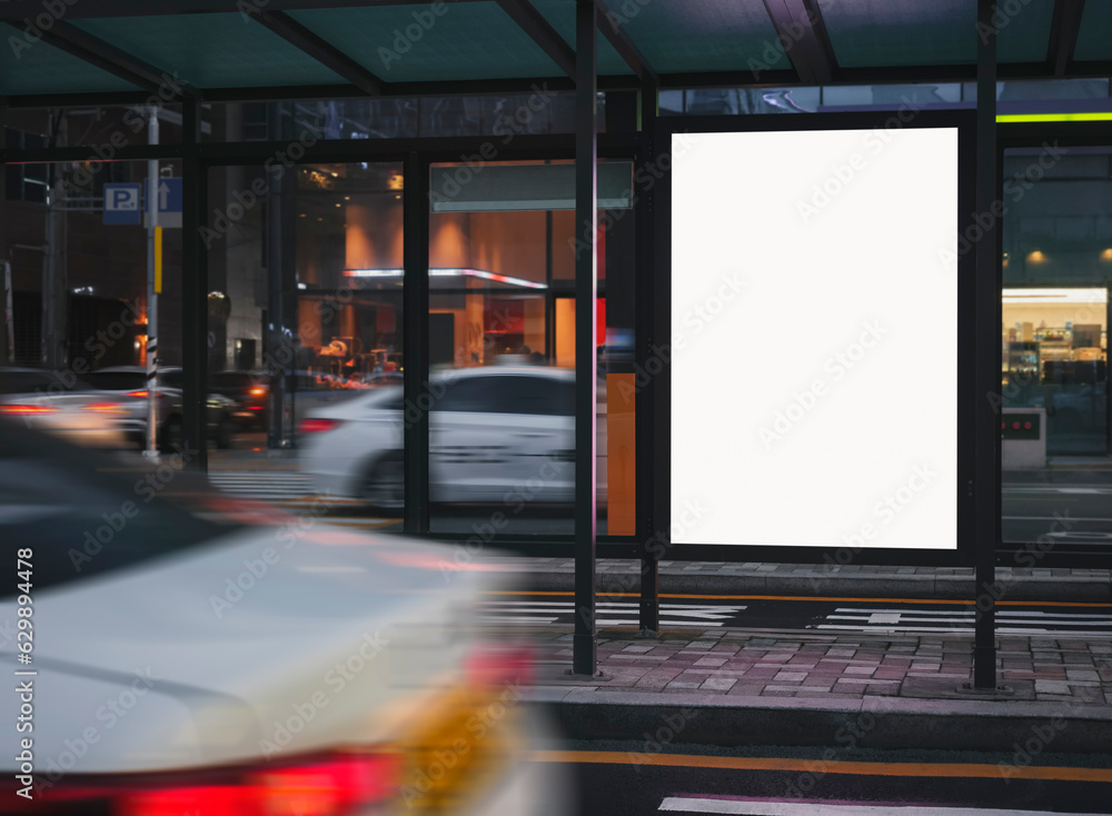Blank white Banner light box Media Advertisement at bus stop City street Mock up board template