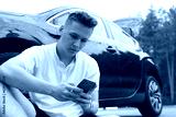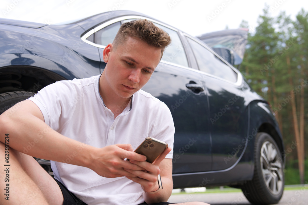 driver with a broken car, think what to do on the side of the road