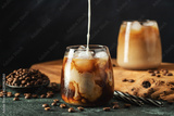 Ice coffee in a tall glass with cream poured over, ice cubes and beans on a dark concrete table.