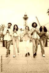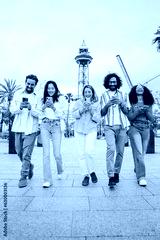 Vertical. Group of smiling multiracial young people using their mobile phones, walking on the street, laughing and having fun together. Best friends chatting or sharing text messages with cellphones
