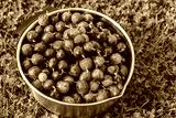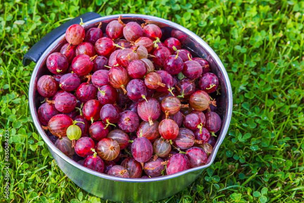 Macro view of bowl with red gooseberry on green grass lawn background.