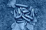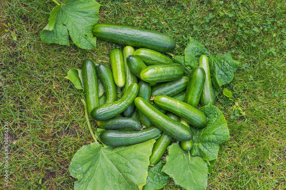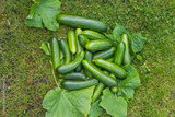 Beautiful view of cucumber harvest on green leaves and green grass lawn background.