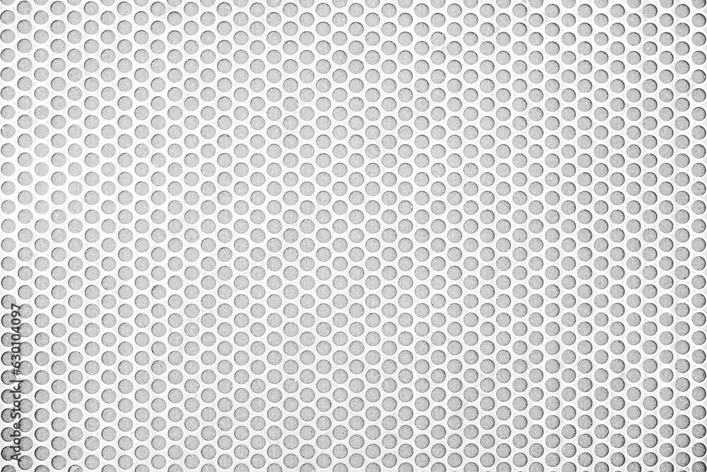 Empty white (light gray) perforated metal grid with circular holes for abstract horizontal seamless, rounded mesh plate background, steel texture, space patterns for work, modern wallpaper,close up