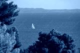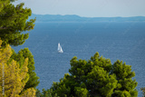 View over lush green pine trees towards sailboat sailing on the Adriatic Sea