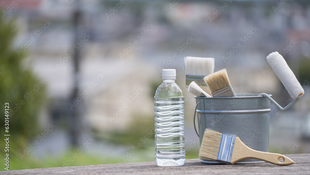 塗装道具とペットボトルの水|屋外作業の熱中症対策 イメージ